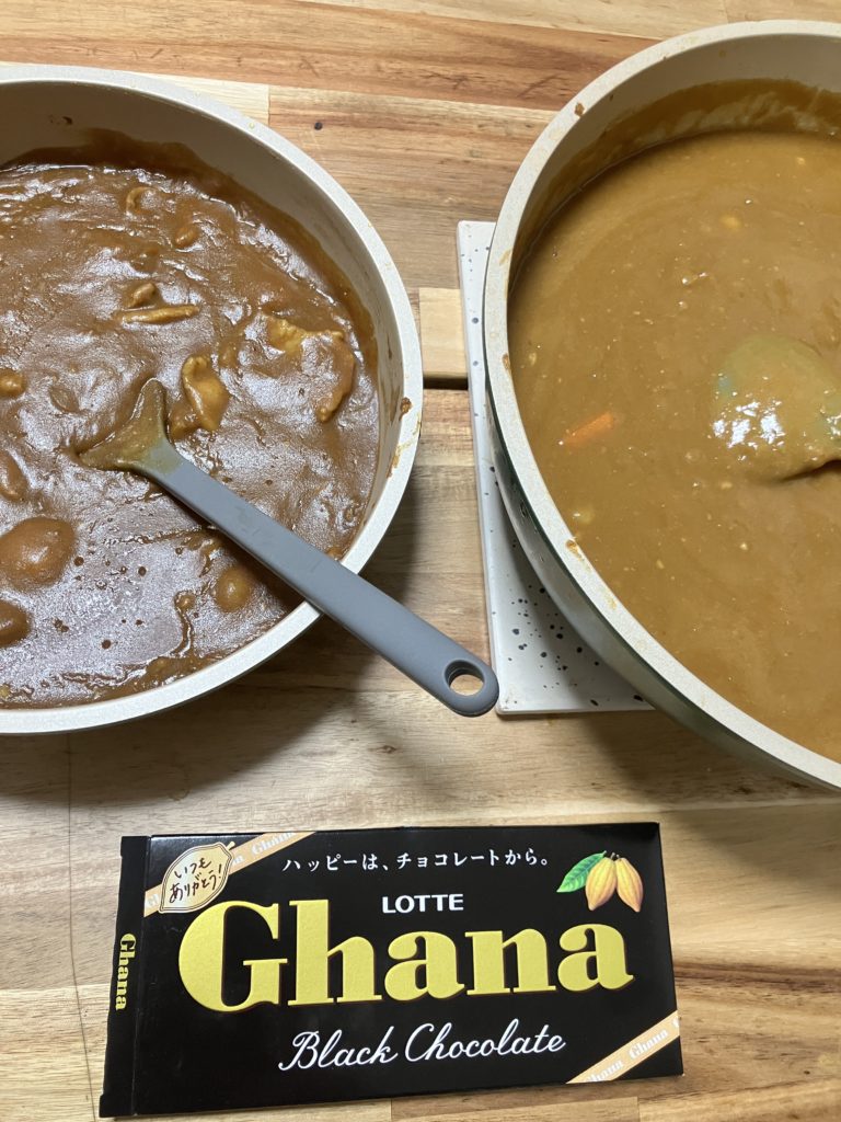 【てくてく流メモ】 第1回で余った2日目のカレー。前回の「ウスターソース&ケチャップ&バター」に対し、パパとお兄ちゃんから「ちょっと酸味が気になるかも」という声があったんです。 そこで、「チョコレートを足せば、酸味が抑えられて甘みとコクが出るのでは?」と思いつき、挑戦。小鍋1つ分くらいの量に、チョコを8〜10グラムほど投入して、しっかり溶かしてみました。